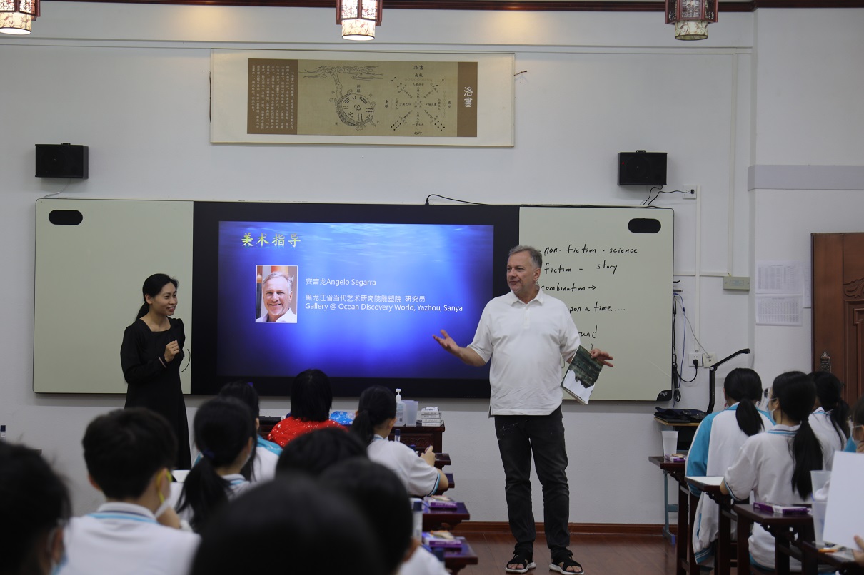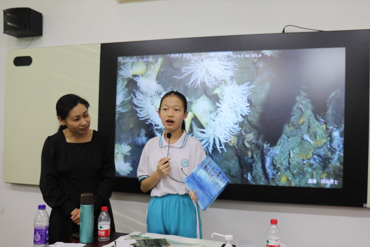 首先,來自深海所地外海洋系統研究室劉翠艷研究員為同學們開展生動的科普宣講,以幻燈片展示現場交流互動以及視頻介紹等方式通俗易懂地傳授生命的豐富形式、講述海洋故事,科普深海知識,宣教“地外海洋”概念,提升海洋文化的親和力、感召力與影響力。同學們聽得津津有味,受益匪淺。在隨后的藝術創作環節,活動特邀藝術家Angelo Segarra先生作為現場美術指導,引導學生們繪制編寫一個科學性或科幻性的海洋故事。活動中,學生們認真作畫,在水彩描繪的背景上勾畫出海洋中的珊瑚、水草、魚、蝦、蟹、水母、鯨魚等海洋生物,呈現他們腦海中的海洋故事。活動最后,學生們現場分享自己的作品初一的陳雅昀同學生動形象地繪制了海洋中危險環境,提醒大家要敬畏海洋,不要到危險未知區域玩耍;李雅倩同學則描繪了一只誤吞塑料袋的小鯨魚痛苦地向人類呼救,呼吁大家保護海洋環境,重視海洋污染;簡玉萱同學則用擬人的手法編寫了一個小螃蟹和小鰻魚斗智斗勇的故事。活動結束后,同學們紛紛表示對深海科學海洋生態保護以及地外海洋的探索產生了濃厚的興趣。