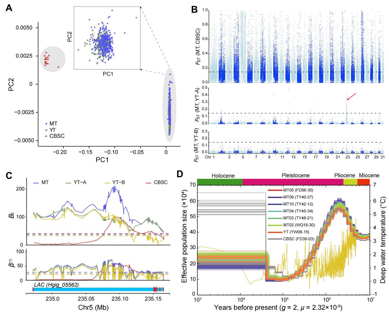 研究結(jié)果顯示H. gigas的有效種群在約100萬年前經(jīng)歷了一次急劇下降,這與更新世深海溫度的大幅波動高度吻合。經(jīng)過遺傳瓶頸后,鉤蝦群體又經(jīng)歷了種群擴張。這一結(jié)果說明,更新世時期大的冰期-間冰期氣候變化可能不僅造成了陸地動物的大規(guī)模滅絕,而且也深刻影響了深海甚至深淵動物。