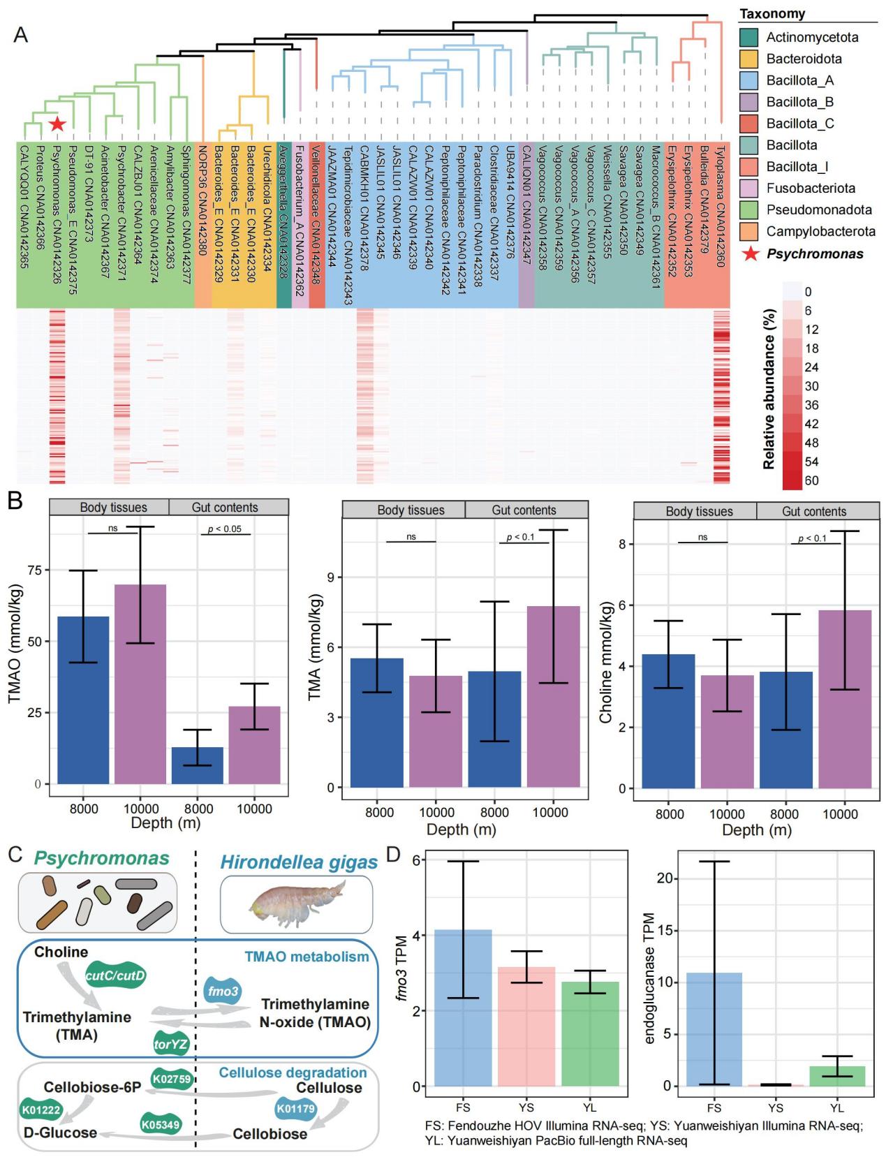 氧化三甲胺(TMAO)是一種滲透調(diào)節(jié)物質(zhì),在滲透壓調(diào)節(jié)以及在高靜水壓條件下維持細(xì)胞完整性方面發(fā)揮著重要作用。檢測發(fā)現(xiàn),隨著深度增加,鉤蝦腸道內(nèi)容物中TMAO濃度顯著升高,體組織中也呈現(xiàn)類似趨勢。鉤蝦自身編碼fmo3基因,可將三甲胺(TMA)轉(zhuǎn)化為TMAO。而其優(yōu)勢共生菌Psychomonas的基因組中攜帶cutCcutD基因簇,可將膽堿分解為TMA;同時擁有torYZ操縱子,可以將TMAO還原為TMA,從而調(diào)控宿主體內(nèi)的TMAO濃度,形成動態(tài)平衡。