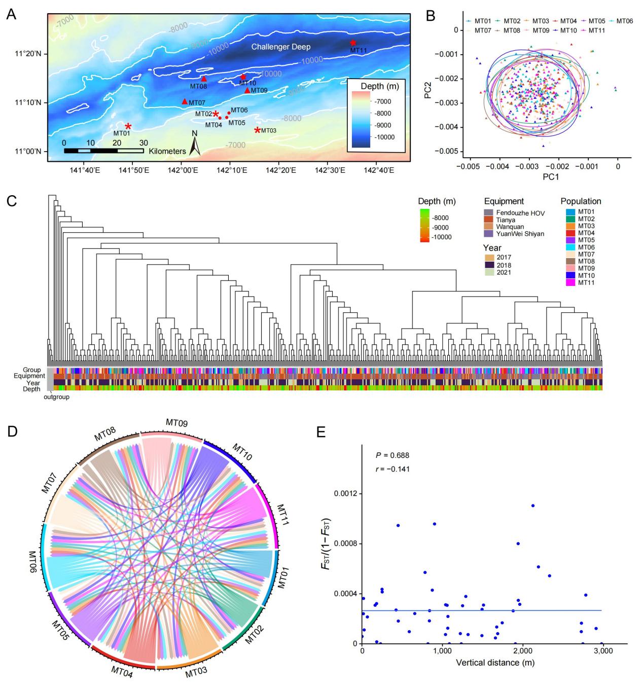 研究團(tuán)隊對馬里亞納海溝的510只(11個群體)、雅浦海溝94只(1個群體)及西菲律賓海盆深淵區(qū)的18只(1個群體)H. gigas個體進(jìn)行了高覆蓋的全基因組重測序和群體遺傳學(xué)分析。結(jié)果顯示來自馬里亞納海溝11個不同深度(~7000-11000米)群體不存在遺傳分化,表明生活在馬里亞納海溝內(nèi)的鉤蝦是一個完全混合的群體,高靜水壓不會限制其在海溝內(nèi)的垂直遷移。而西菲律賓海盆的鉤蝦群體與馬里亞納海溝的群體則表現(xiàn)出明顯的遺傳分化。這兩個海溝間相隔~1500公里,表明地理隔離阻礙了群體間的基因交流。